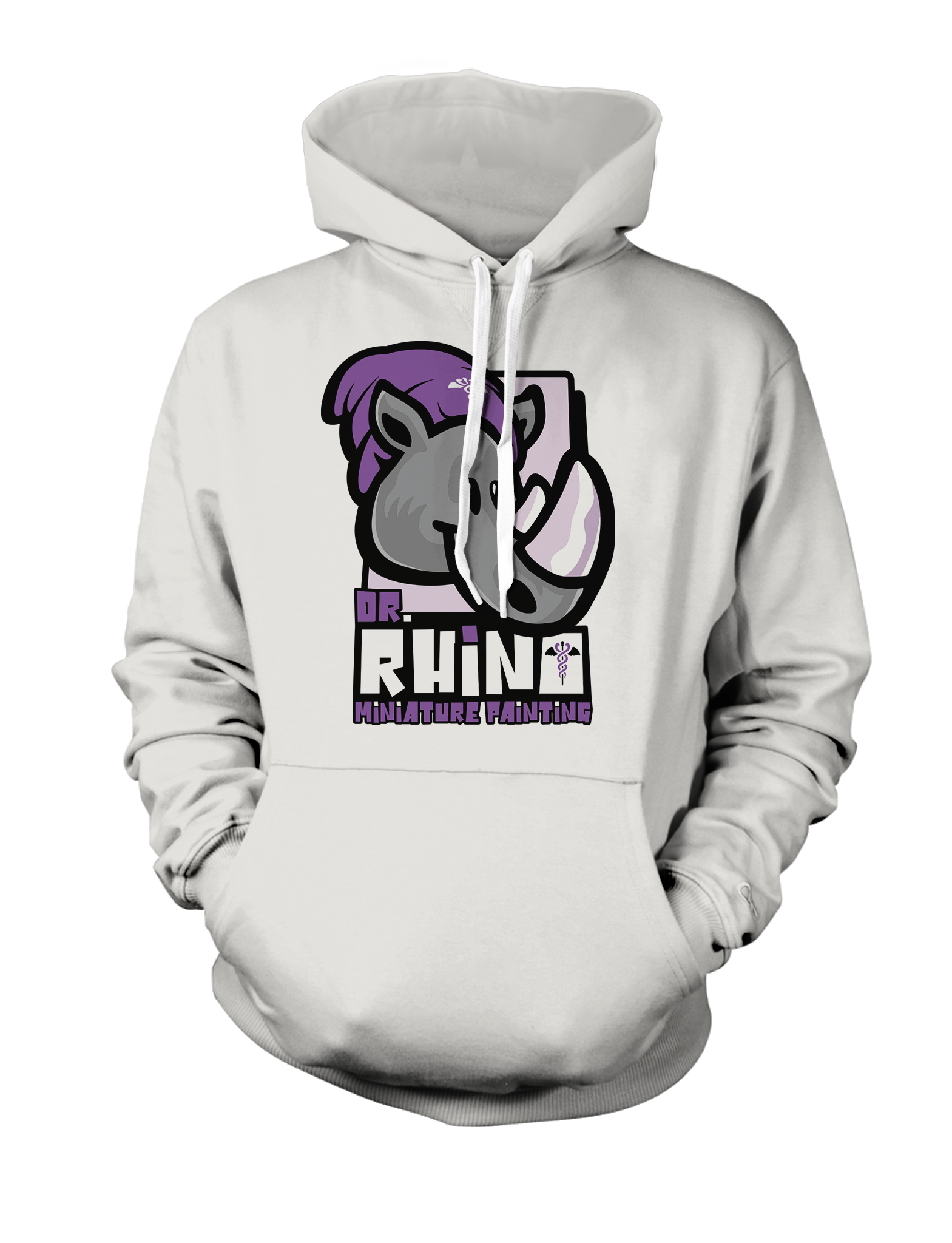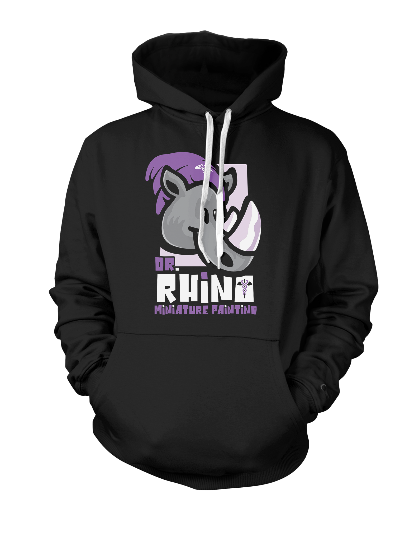 Dr. Rhino's main logo on a comfortable black or white hoodie.